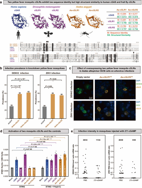 上述研究以昆虫为模式类群,在主要类群尺度上绘制了蛋白结构图谱,并建立了面向宏观演化问题的结构比较基因组学框架,为在结构层面解析蛋白功能的大规模演化提供了关键资源与方法基础。研究还揭示了先天免疫受体cGLR在昆虫中的广泛分布与结构保守性,并在埃及伊蚊中验证其功能,为理解昆虫抗病毒免疫提供了新机制,也为研发蚊媒病毒干预策略提供了潜在的分子靶点。