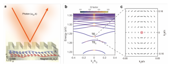 该研究在二维磁性半导体超表面中构建了一种磁振子—光子界面,通过利用二维磁性半导体中强光—物质相互作用与磁电效应之间的协同效应,在CrSBr磁性光子结构中展示了利用外磁场或相干磁振子对激子极化激元进行静态和超快调控的能力。更重要的是,该研究观测到了依赖于磁振子模式和动量的磁振子—激子极化激元相互作用,为泵浦光子到光学磁振子的直接动量转移提供了有力证据,表明强耦合磁振子—激子极化激元杂化态已形成,揭示了磁性体系中自旋、磁振子与光子之间的相互作用特性。