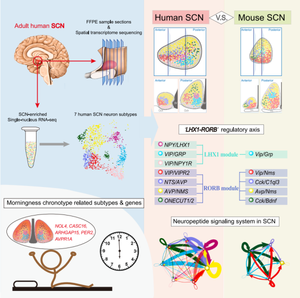 该研究绘制了全面的人类SCN细胞图谱,为基础与临床医学研究提供了重要资源,也为理解人类生物钟的分子与神经机制提供了依据。