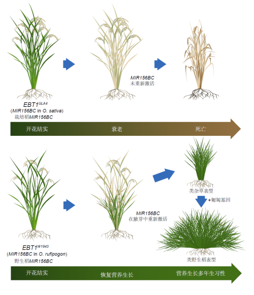 miR156是植物的“年龄开关”。传统认为,它在植物幼苗期高表达,长大后慢慢减少,促使植物从长叶转向开花结果。但新研究发现,野生稻的MIR156BMIR156C在开花后重新被激活,让腋芽逆转发育,恢复生长,不断长出新的分枝,实现无性繁殖。这个独特的现象与野生稻EBT1基因座位的表观修饰状态密切相关。